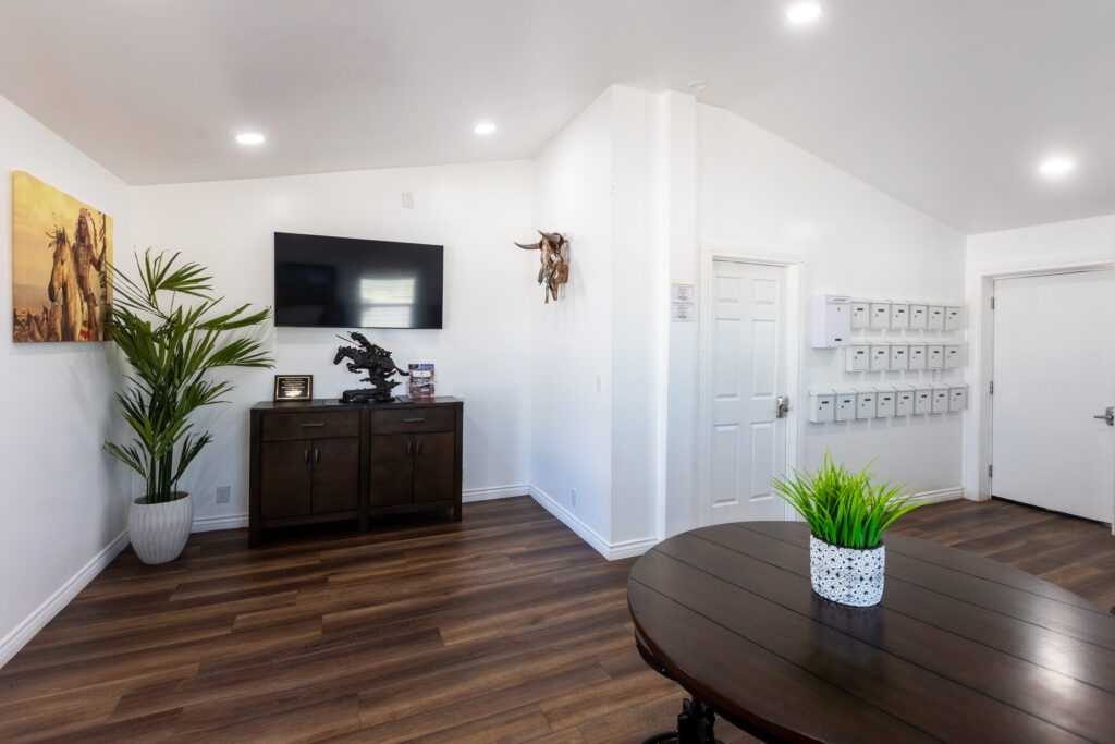 Relax and connect in our modern community center featuring comfortable seating, a large smart TV, board games, and a welcoming space for socializing.