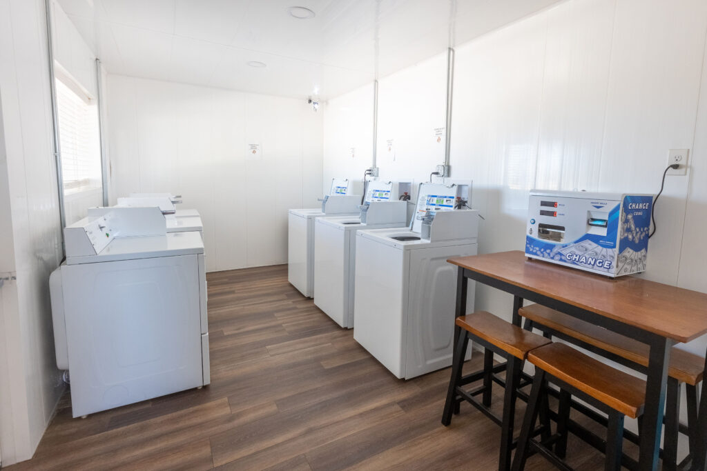 Clean, modern laundry room with multiple washers, dryers, and a change machine.